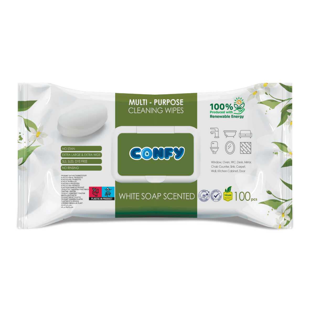 مناديل كونفي متعددة الاستخدام تم تطويرها خصيصًا لتقديم نظافة منعشة وسريعة لجميع الأسطح في المنزل أو المكتب أو السيارة. تأتي هذه المناديل في عبوة اقتصادية تحتوي على 100 منديل، وتتميز بقدرتها على إزالة الأوساخ والبقع والميكروبات بفضل تركيبتها الفعالة مع عطور متنوعة تضيف رائحة مميزة لمنزلك.