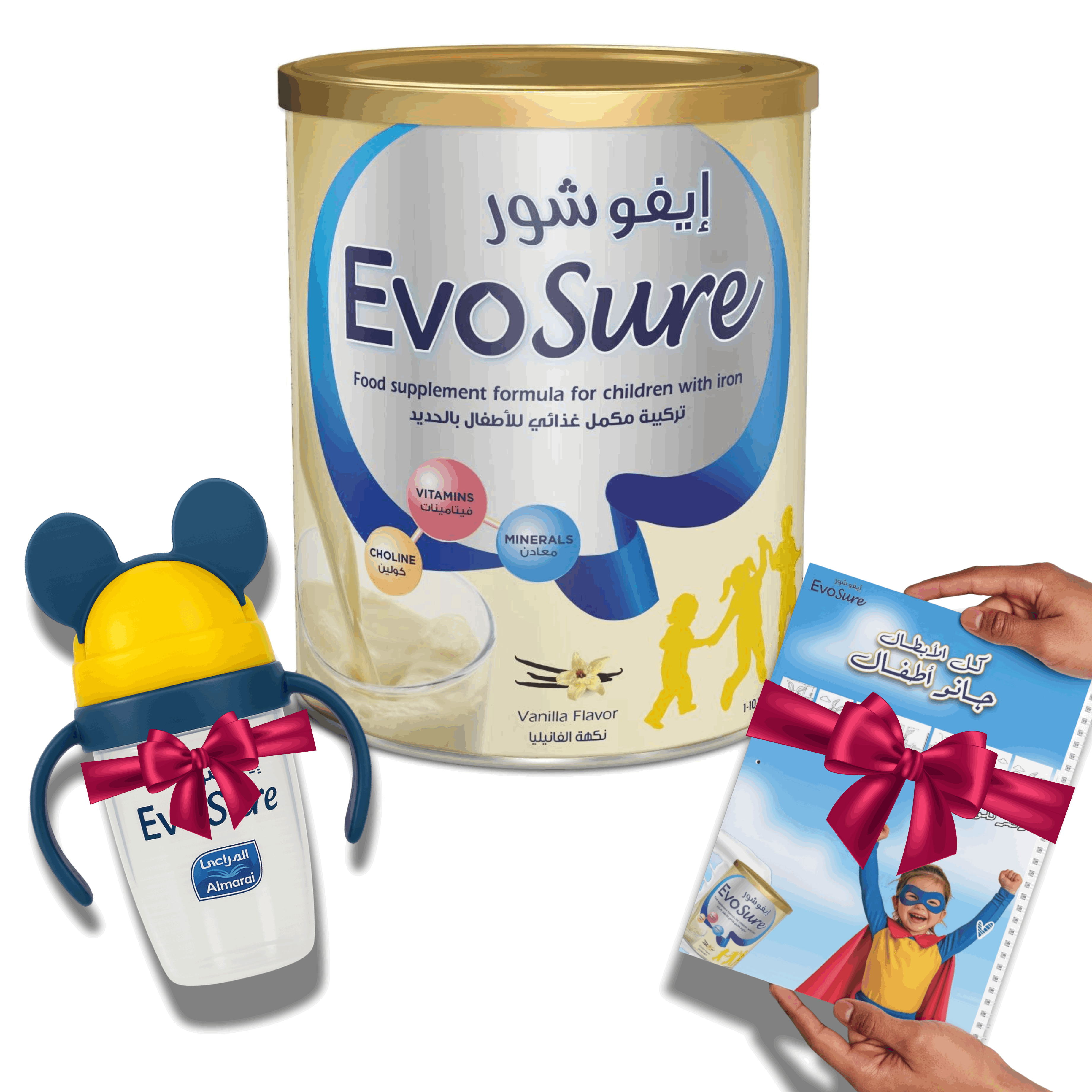 خلي طفلك يبدأ السنة الدراسية بصحة ونشاط مع إيفوشور! مكمل غذائي متكامل للأطفال من عمر سنة إلى 10 سنوات، غني بالفيتامينات والمعادن والأحماض الدهنية الأساسية، يساعد على النمو الطبيعي، تقوية المناعة، وزيادة التركيز… وكل هذا بطعم الفانيليا اللذيذ وخالي من الغلوتين. العرض الحالي لفترة محدودة: مع كل عبوة يفوشور ستحصلين على دفتر رسم + كوب هدية لطفلك.