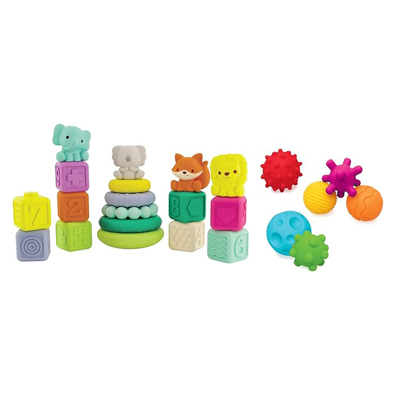مجموعة ألعاب الأنشطة من إنفانتينو Stackables Balls Blocks & Buddies تقدم تجربة لعب ممتعة وغنية للأطفال حيث تضم 24 قطعة متنوعة تجمع بين الكرات والمكعبات والخواتم والحيوانات الصغيرة صُممت لتطوير المهارات الحركية الدقيقة والإدراك من خلال التكديس والمطابقة واللعب التخيلي الألوان الزاهية والقوام المتنوع والأشكال المختلفة تحفّز حواس الطفل وتدعم استكشافه الحسي بطريقة ممتعة يمكن للطفل لمس الكرات ذات الملمس المميز والتفاعل مع الحيوانات الصغيرة لتعزيز خياله
