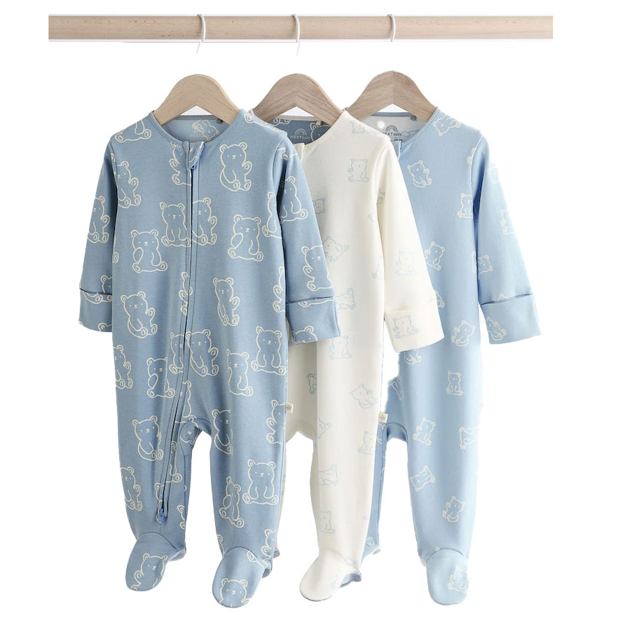 طقم مكون من 3 أوفرات نوم للأطفال، مصنوعة من قطن ناعم جدًا لراحة طفلك. تحتوي على سحّاب ذو اتجاهين لسهولة اللبس والتغيير. كما تتميز بقفازات مدمجة لحماية الطفل من الخدوش حتى 3-6 أشهر، وأقدام غير قابلة للانزلاق من 9-12 أشهر. كما أنها قابلة للغسيل في الغسالة لسهولة العناية بها.
