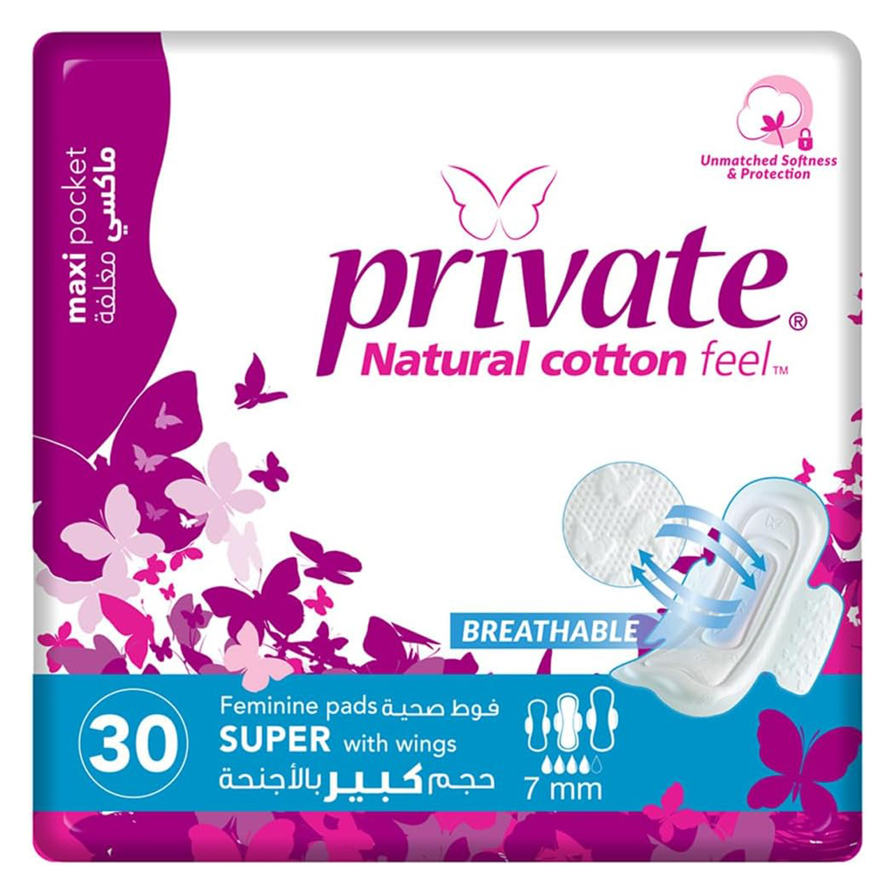 فوط برايفت ماكسي بوكيت مريحة وناعمة على بشرة البنات، مصممة لتوفير حماية وثقة خلال الدورة الشهرية. تشبه ملمس القطن، ما يجعلها لطيفة على الجلد. الحجم كبير، وتأتي بـ 30 فوطة في عبوة صغيرة وسهلة الحمل، وتحافظ على الجفاف والراحة طول اليوم.